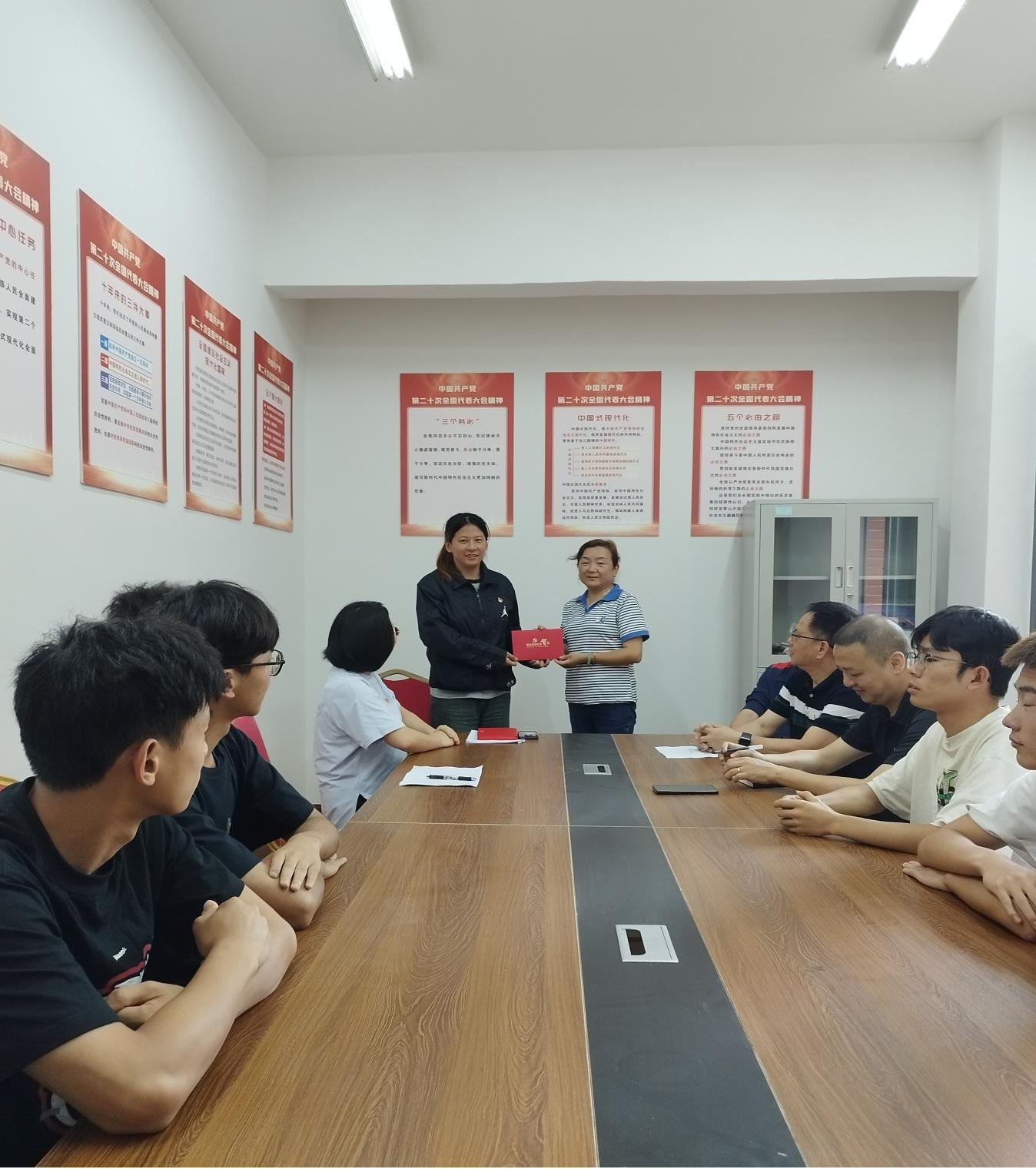 活动中,党支部为本季度入党的同志过“政治生日”。朱晓晓为朱蓉君老师送上政治生日贺卡并送上生日祝福。