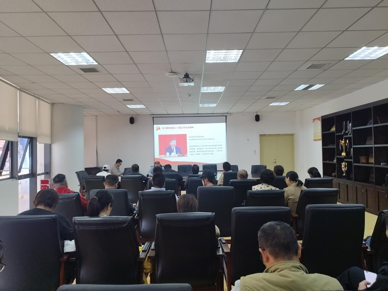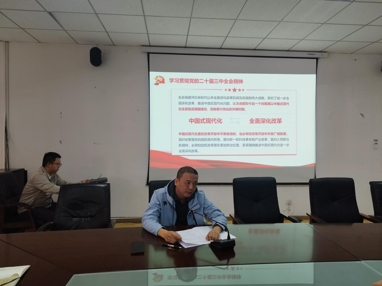 会议室以《党的二十届三中全会公报要点学习》为题,结合学院工作实际,给全体党员上了一堂专题党课。院党委班子、各科室负责人、支部书记、全体党员聆听了专题党课。