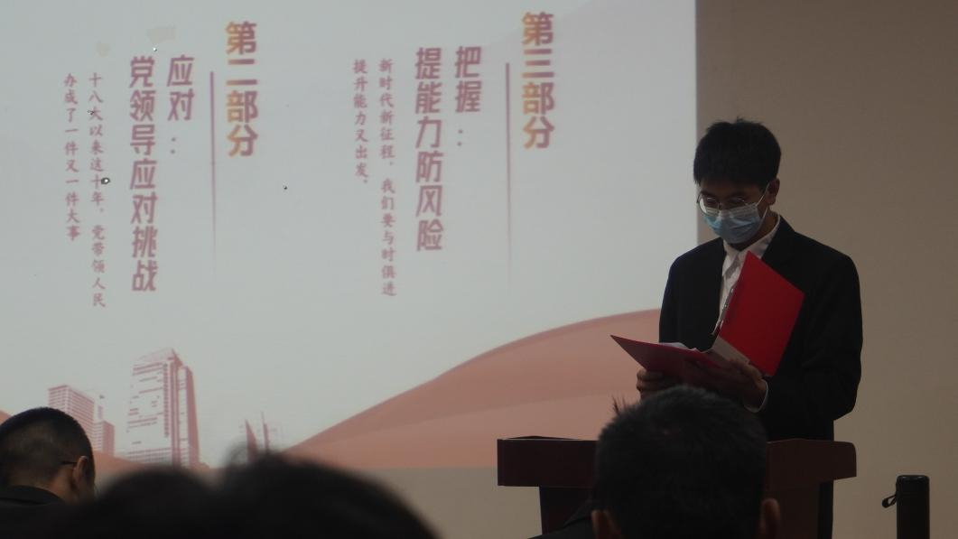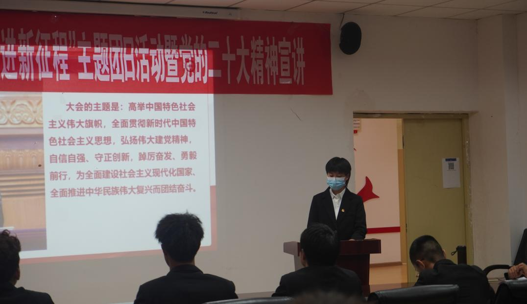 学生团员代表杨亿从党和人民事业具有重大现实意义和深远历史意义的三件大事:一是迎来中国共产党成立一百周年,二是中国特色社会主义进入新时代,三是完成脱贫攻坚、全面建成小康社会的历史任务,实现第一个百年奋斗目标为全体学员解读了党的二十大报告精神。