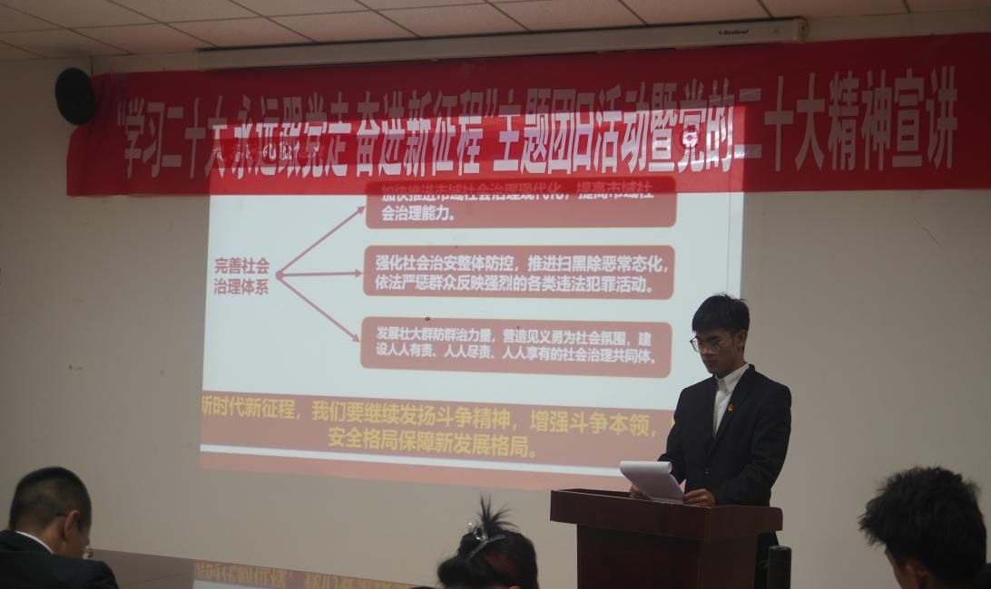学生团员代表华一铭他从8个方面向同学们宣讲了党的二十大精神,强调要深刻领会党的二十大主题,深刻领会过去五年的工作和新时代十年的伟大变革,深刻领会开辟马克思主义中国化时代化新境界,深刻领会中国式现代化的中国特色和本质要求,深刻领会全面建设社会主义现代化国家的目标任务,深刻领会教育科技人才、法治建设、国家安全等方面的重大部署,深刻领会坚持党的全面领导和全面从严治党的重大部署,深刻领会应对风险挑战的重要要求。