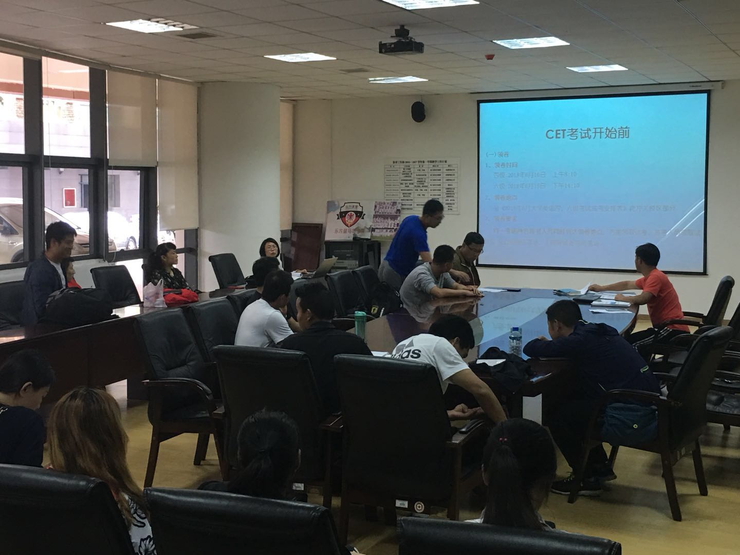 (陆双妹 报道 王玉清拍摄)2018年6月12日下午在体育馆会议室举行2018年6月全国大学生英语四六级监考培训。部门领导和全体教职工参加了本次培训,培训由教务办陆双妹老师主讲。教务处教务科熊洁老师受邀全程参与该培训。