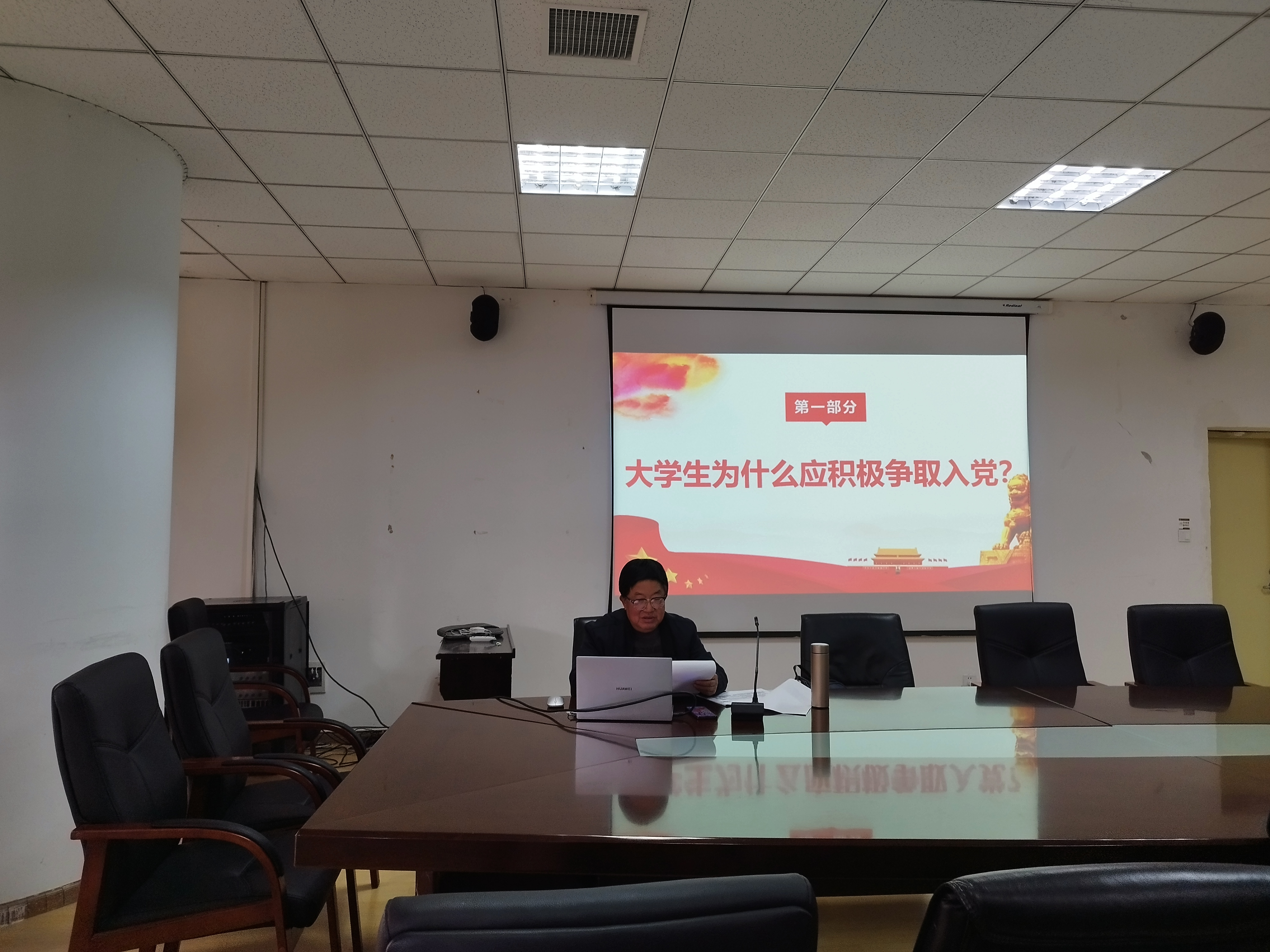 会议室为学院学生上党课,学院党委书记李国和、专职组织员冉晓鸣,学院学生党员、入党积极分子和关工委委员共45人参加了党课。