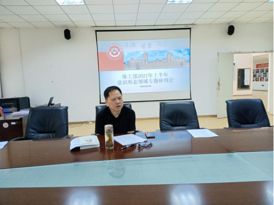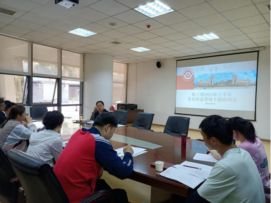 (体工部 陆双妹图文报道)5月 11 日上午,体育工作部在会议室召开了2021年上半年意识形态领域工作专题研判会,参会议人员有部门班子、直属支部委员、党小组长、科级干部(含教研室主任)。本次会议由直属党支部书记李国和主持。