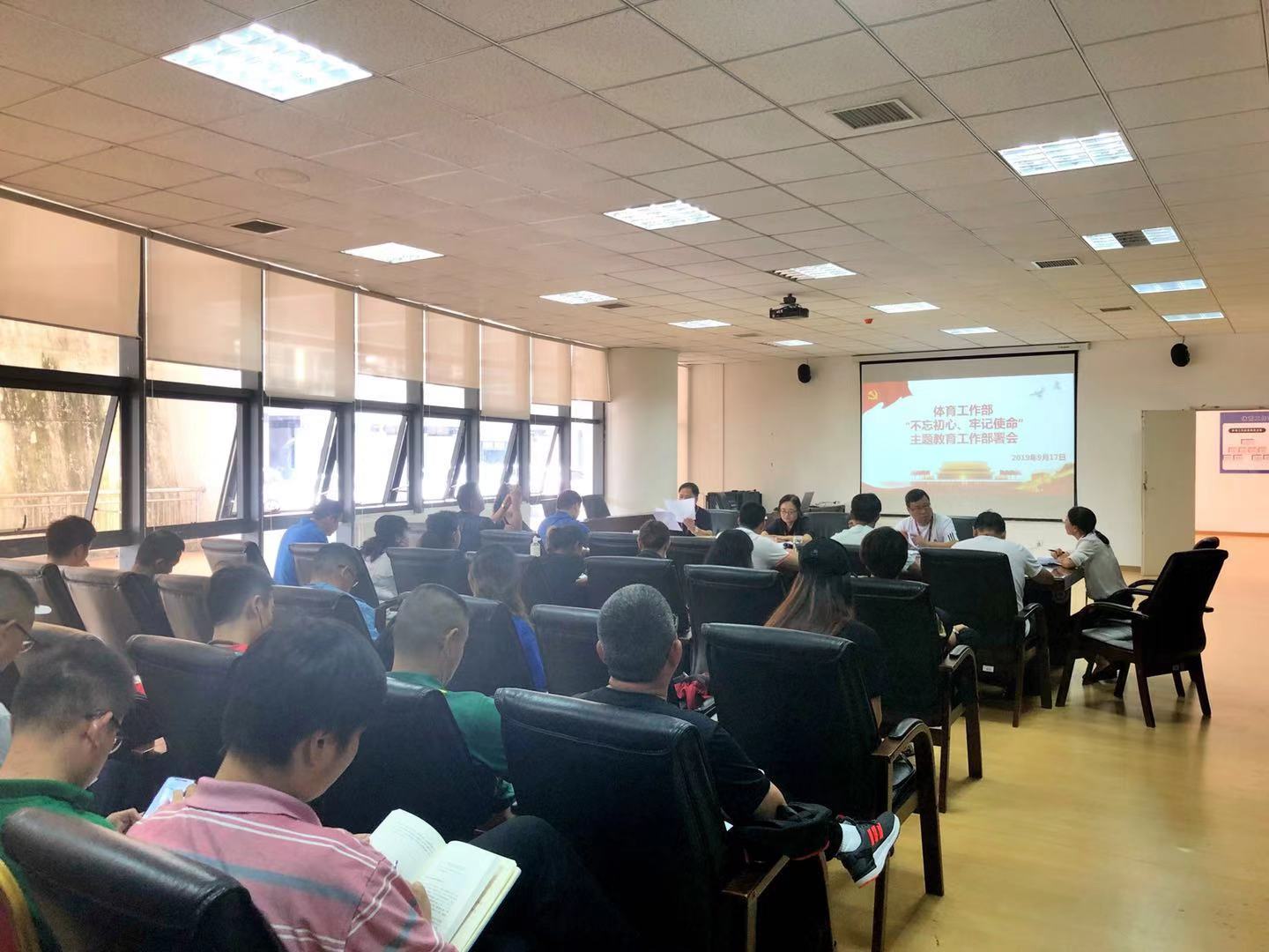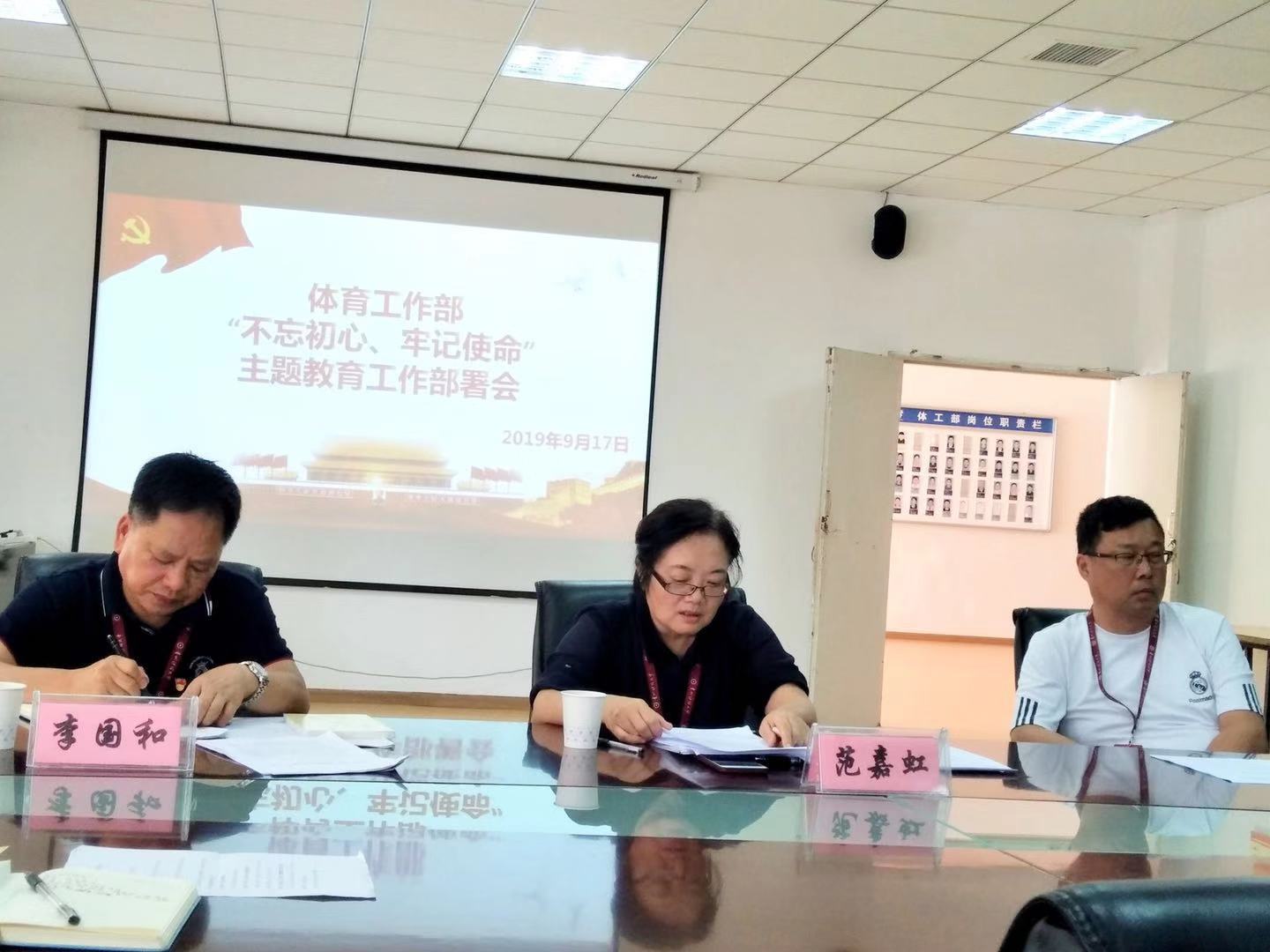 体育工作部召开“不忘初心、牢记使命”主题教育工作部署会。学校第四指导组、组织部正处级组织员范嘉虹,成员詹诗出席会议,体工部全体教职工参加会议。体工部直属党支部书记李国和主持会议。
