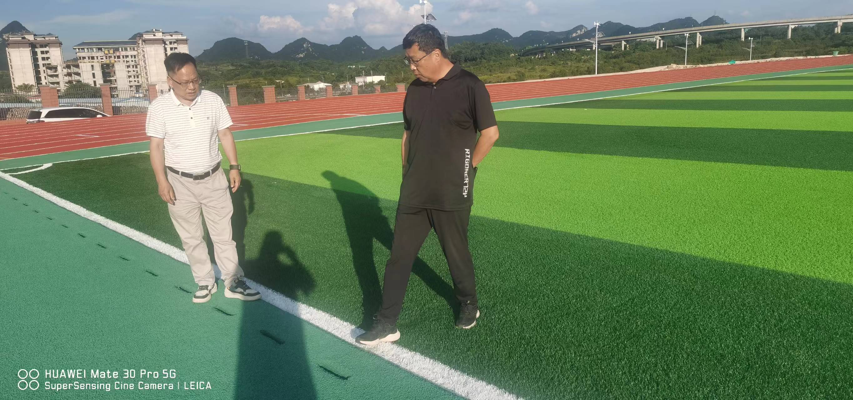 学院领导跟学校项目部负责人及施工方负责人一起检查东区体育运动场,就存在的问题进行探讨,商讨解决方案。