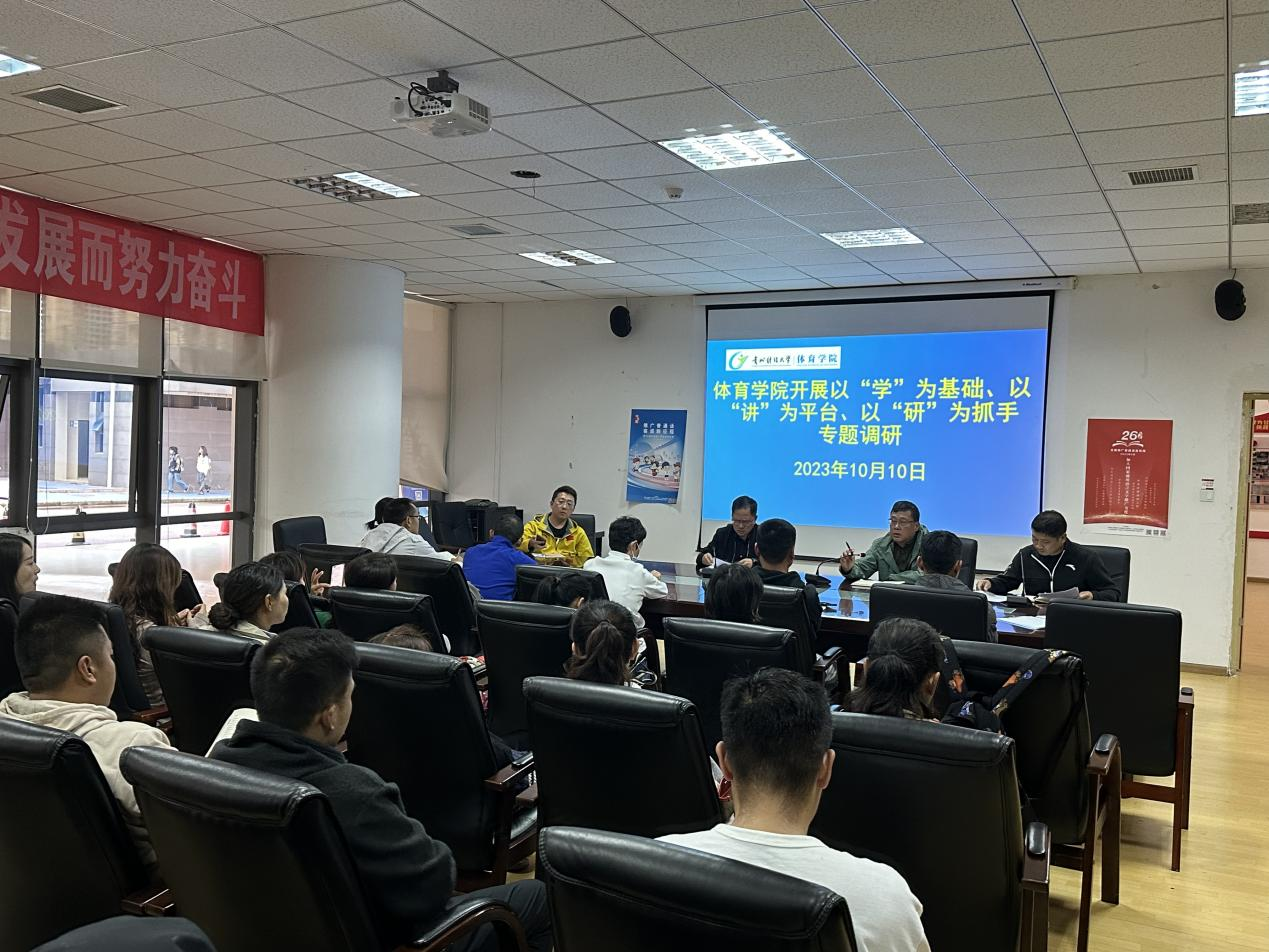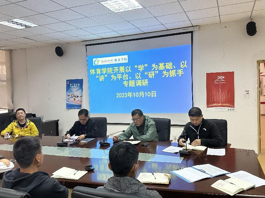 于2023年10月10日在学院会议室开展以“学”为基础、以“讲”为平台、以“研”为抓手专题调研。余兵院长主持调研会,学院领导出席,全体教师到会参与。